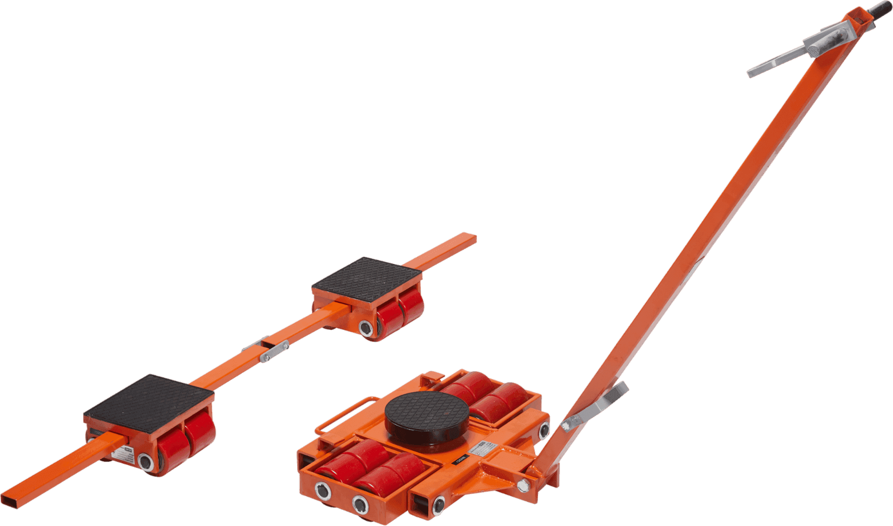 | Ein Set, bestehend aus einem Lenkfahrwerk und einem Rollfahrwerk; ab 16 t sind die Transportfahrwerke mit einer Transportöse ausgestattet. |